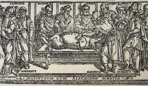 the Parts of the Body had gained a reputation, a rumor went around the city that in it he had described anatomical structures that could not be seen in dissection. At first, he tells us, “my only response was contemptuous amusement,” but soon his friends (he says) begged him to give a public demonstration of his skill and knowledge. He refused, but his rivals kept going to the Temple of Peace, where people interested in learned matters met, and making fun of him. Finally Galen gave in, hired a hall, and over several days gave a demonstration that was part anatomical lesson, part medical history lecture, and part theatre. Books were part of the act. Galen piled the books of all the writers on anatomy in front of him and challenged the audience to name a part of the body; Galen would then dissect it—using animals, not human cadavers—and show how his description differed from those of his predecessors. Needless to say, Galen succeeded—and got another book, the now lost Lycus’ Ignorance in Anatomy, out of the experience. (He tells the story in chapter 2 of On My Own Books.)